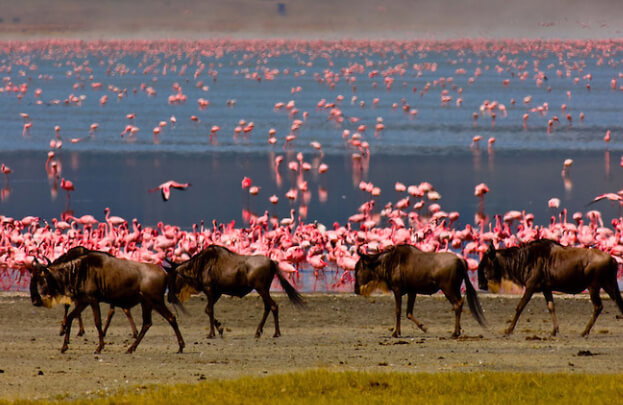 Today proceed for a full day Crater tour with packed lunch. Ngorongoro Crater is said to be one of the natural wonders of the world. A spectacular game haunt, the 102-square-mile crater is a perfect caldera, one of the largest on earth. Millions of years ago a smoldering volcano collapsed, creating the crater and a home for thousands of animals amidst its many types of vegetation grown and nourished over the centuries. Over 30,000 animals live here: prides of lion, elephant, leopard, cheetah and giraffe, gazelle by the thousands and multitudes of wildebeest. Dinner and overnight at Ngorongoro.
